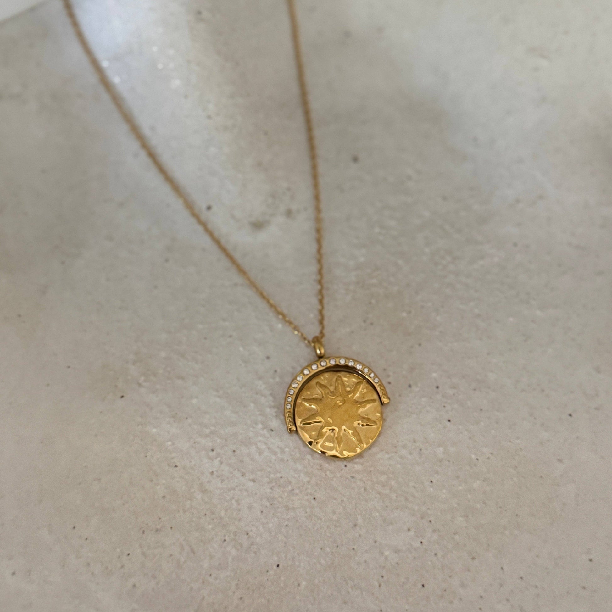 This textured pendant necklace represents the transition from golden days to moonlit nights. Set beautifully on a spinning charm, the wearer can decide which side to display.